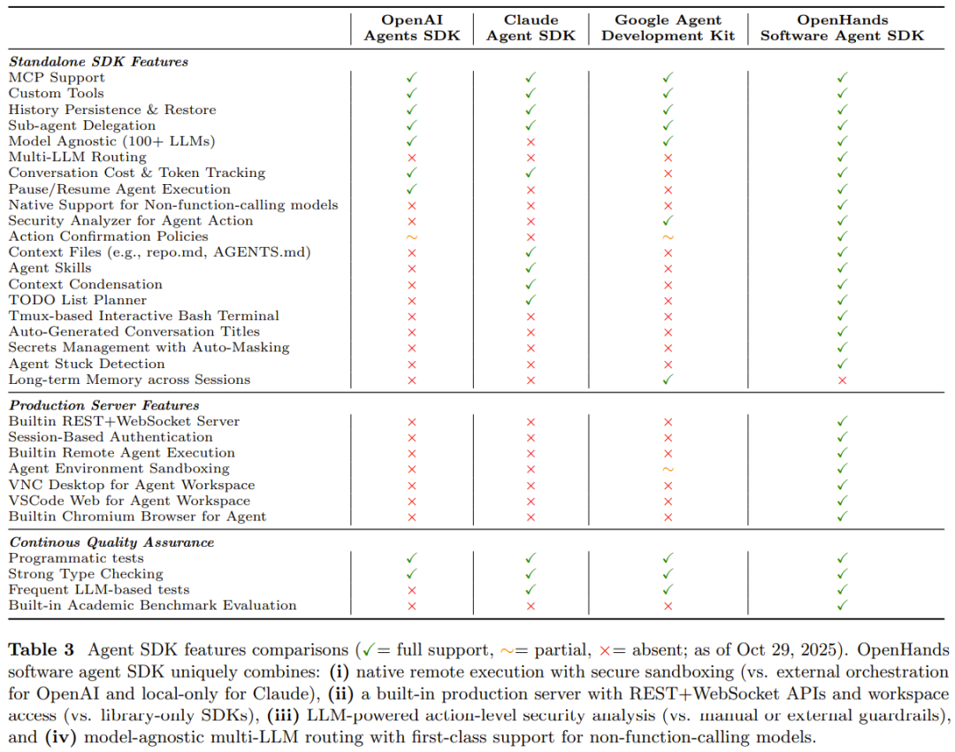 该团队还系统地比较了其 SDK 与 OpenAI Agents SDK、Claude Agent SDK 和 Google ADK 的 31 个特性,发现尽管有 15 个特性与它们中的至少一个共享,但 OpenHands 的 SDK 独特地结合了 16 个额外特性,包括原生远程执行、带沙盒功能的生产服务器,以及跨越 100+ 供应商的模型无关的多 LLM 路由。