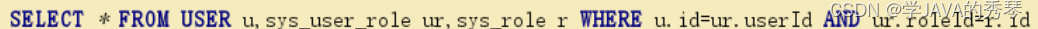 select u.,r.,r.id rid from user u left join user_role ur on u.id=ur.user_id inner join role r on ur.role_id=r.id;