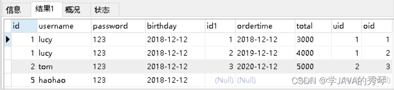 2.查询语句:select * from orders o,user u where o.uid=u.id;