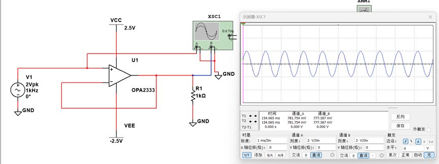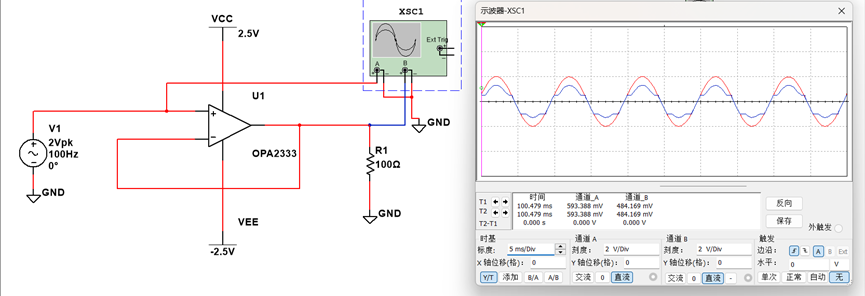 设计一电压跟随器输出2V信号。则根据输出短路电流,该电路只能支持最小400欧姆的负载,若小于400欧姆,则驱动电流达到最大也无法支持2V信号输出。仿真如下: