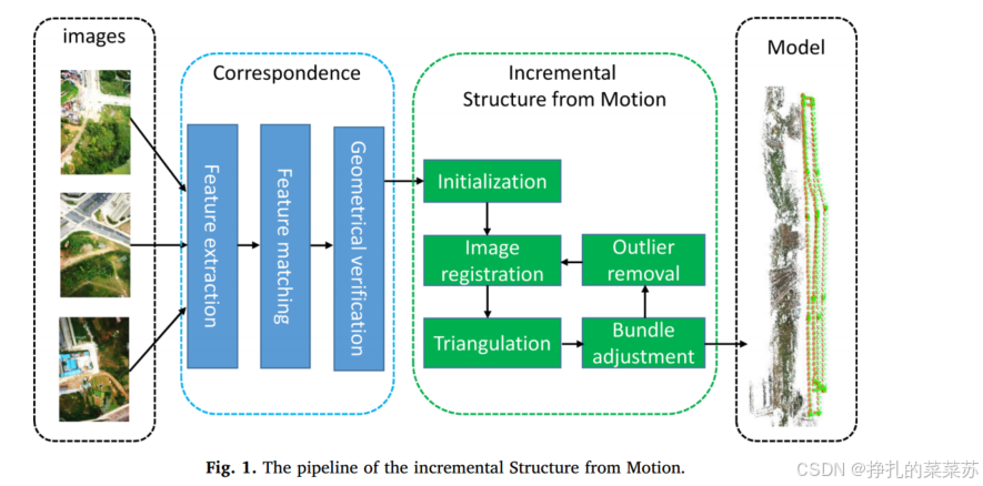 增量式SfM的总体工作流程如图1所示。它分为两个主要部分,分别称为对应搜索和增量重建。第一个组件的目标是为两幅图像搜索可靠且分布良好的特征匹配,包括三个步骤,即特征提取、特征匹配和几何验证。第二个组件的目的是估计图像的姿态和场景的3D点。这可以通过五个步骤来实现,包括初始化最佳图像对的选择,图像方向的配准,三维点计算的三角测量,局部和全局细化的束调整,以及异常值的去除。本节将简要介绍SfM解决方案的工作流程