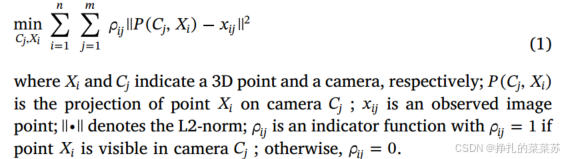 对于局部和全局BA,将相机姿态和场景点的精炼问题建模为重投影函数的联合最小化(Triggs et al, 2000),其中轨迹投影与其对应图像点之间的误差总和最小化。BA的目标函数如式(1)所示。