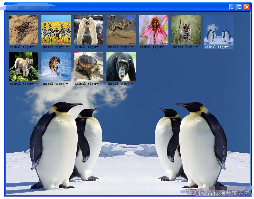 界面效果如下图所示:上面两排为预加载的缩略图,单击单个缩略图则将对应的图片设置为主窗口的背景图片