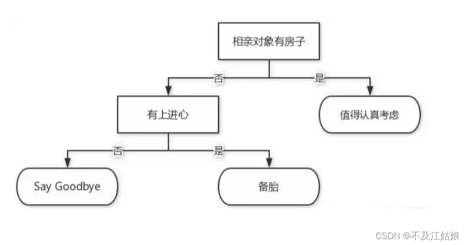 我们看到这个图,这颗树的目的是帮助你找对象。我们假设你找对象有两个标准,一个是有没有房子,一个是是否有上进心(这两个标准呢,用我们的话来说,叫特征值)。假设有5个找你处对象。而你对于上述两个标准,你最看重的是对方有没有房子,可不可以给你一个温软的家,所以首先来给他判断他是否有房子,有的话,那么他就非常符合你的条件,有3个人符合你的这个标准,我们就给这三个人分类到“值得认真考虑”,没有的话,你觉得他有可能是个潜力股,还是可以从里面挑选出优秀的对象的,也就是从第一个标准里淘汰的,任然还可以区分是否优秀,所以你用第二个标准,判断他是否有上进心,这个标准又可以把他分为两类,有1人有上进心,所有这1个人就是“备胎”,剩下1个人就是“Say Goodbye”这一类。总的来说,你就是靠着这两个标准,将相亲对象分为了3类。而你的这种分类方式,就是我要说的决策树。