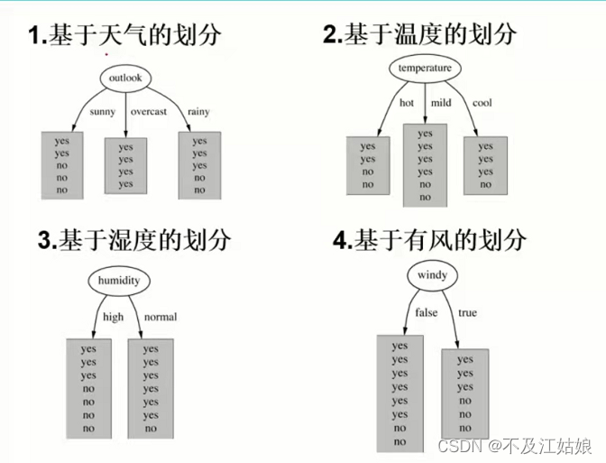 在这个图里,我们在四个条件的前提下,判断是否出去玩。这四个条件就是图上左边四列,分别是天气,温度,空气湿度,和是否有风。我们现在就要确定哪一个条件或者说是特征作为根节点。