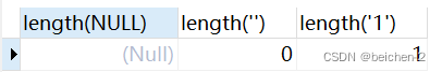 mysql>select length(NULL), length(''), length('1')