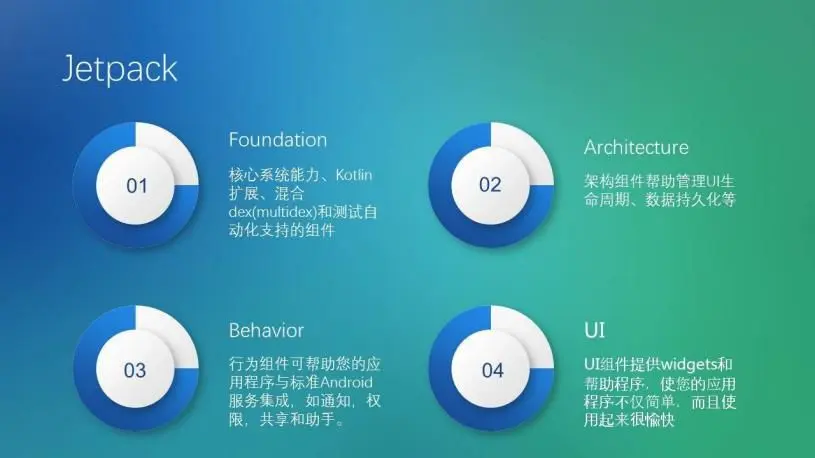 Jetpack,Google 推出的新一代组件、工具和架构指导,旨在加快 Android 应用开发速度。Jetpack 主要分为 4 部分: