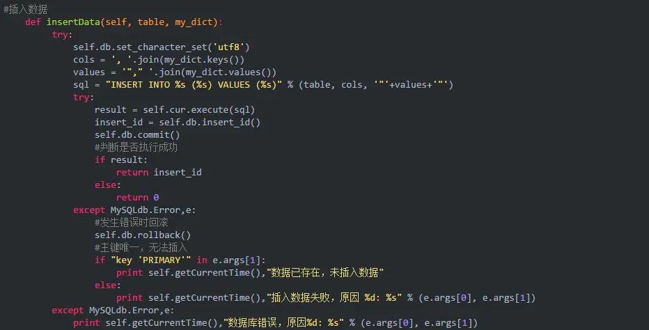 在这里,我们想实现一个通用的方法,就是把存储的一个个内容变成字典的形式,然后执行插入语句的时候,自动构建对应的sql语句,插入数据。