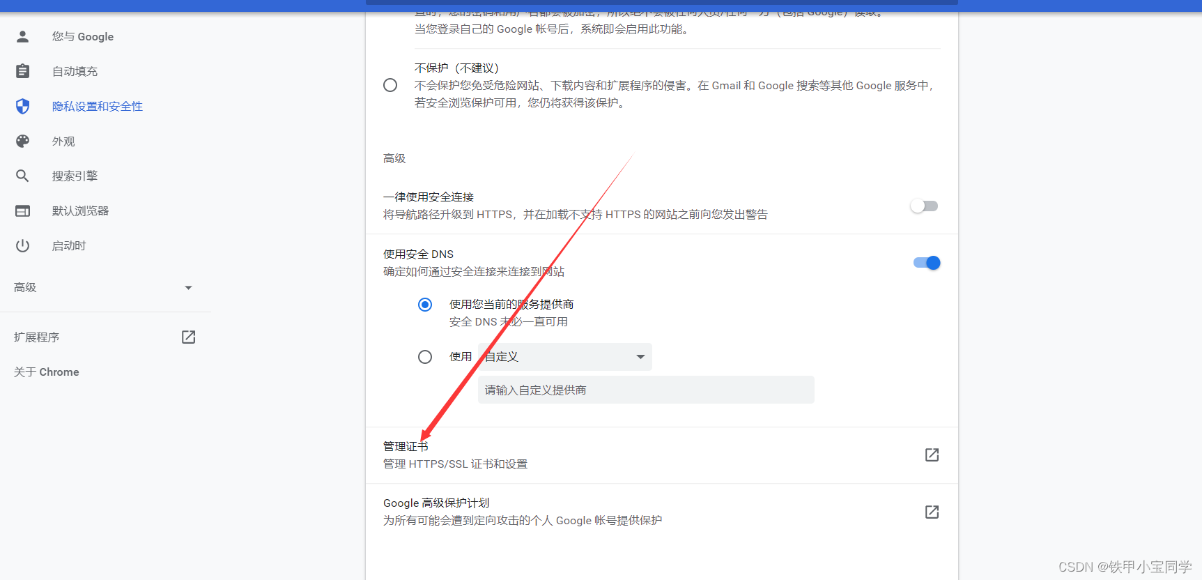 紧接着打开浏览器的设置找到证书管理