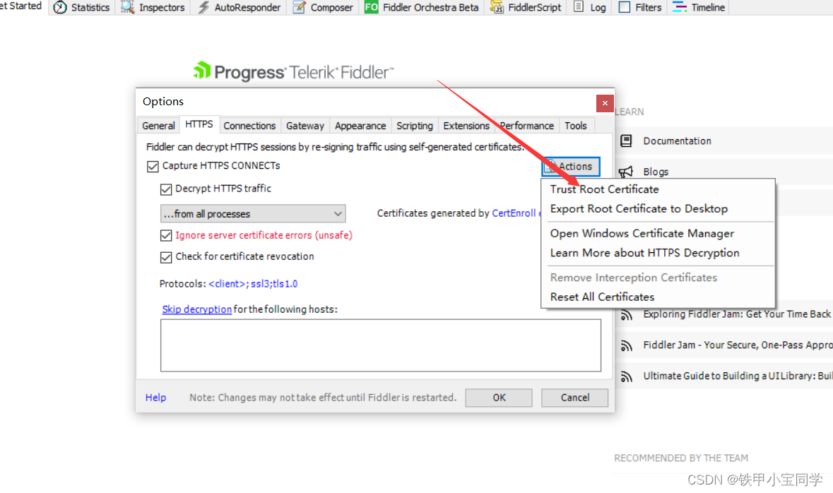 Fidder下载完毕后我们需要对我们的浏览器导入证书,因为只有导入证书,Fidder才能正常的抓包不丢包。