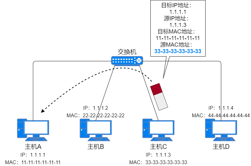 - 更新 ARP 缓存表:主机 A 收到 ARP 响应报文后,将主机 C 的 IP 地址和 MAC 地址记录到 ARP 缓存表中。下次再向主机 C 发送数据时,直接将缓存的目的 MAC 地址进行封装。