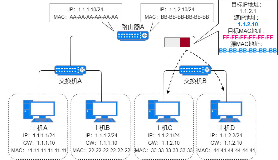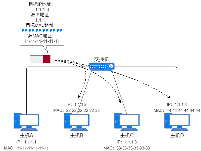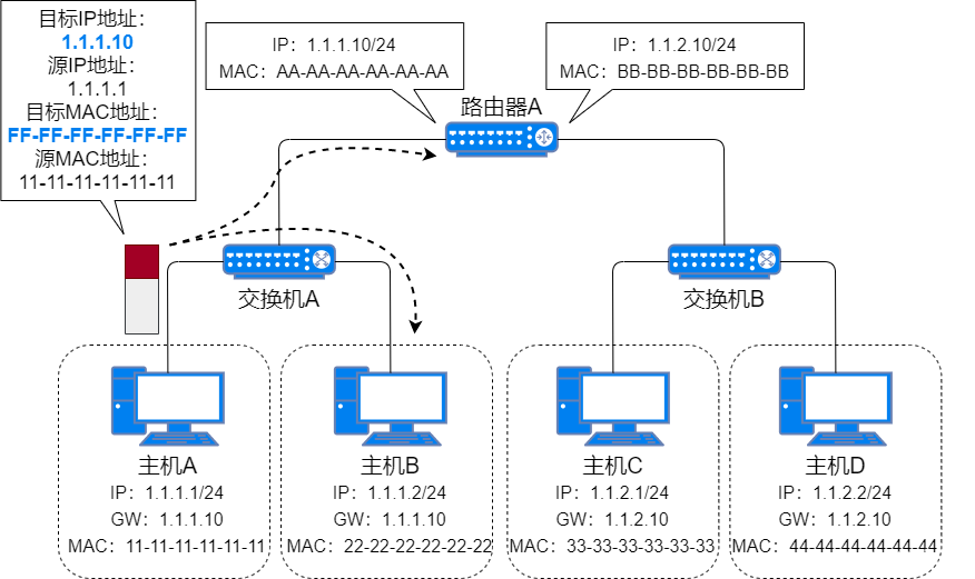 - 主机 A 先将发送给主机 C 的数据放入缓存中,然后发送 ARP 请求报文,主机 A 以网关 IP 地址为目的 IP 地址发送 ARP 广播请求报文;