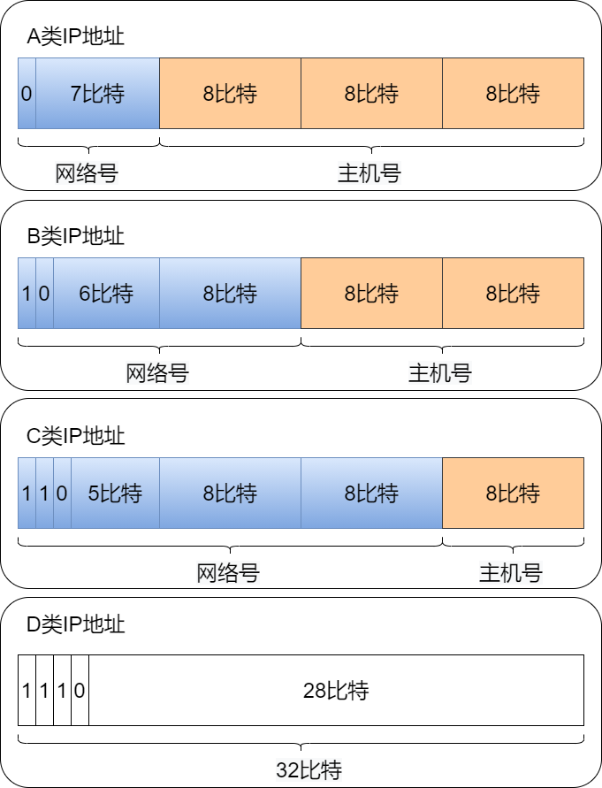 IP 地址分为四类,分别是 A 类、 B 类、 C 类、 D 类(还有一个保留的 E 类)。
