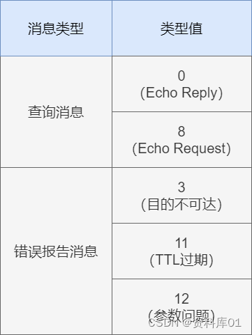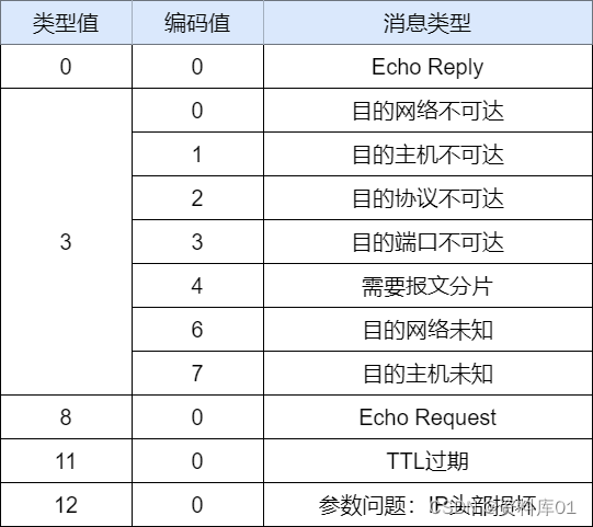 通过类型字段和编码字段的取值判断这个 ICMP 消息的类型。常见的 ICMP 消息所对应的类型和编码值如下图。