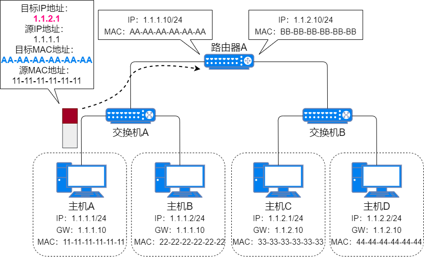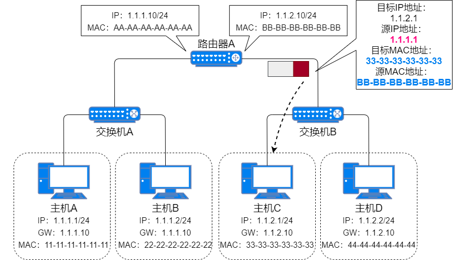 - 路由器收到主机 C 的 MAC 地址后,将其添加到 MAC 地址表中。将主机 A 发送给主机 C 的报文重新封装,以自己的 MAC 地址为源 MAC 地址,以主机 C 的 MAC 地址为目的 MAC 地址,发送给主机 C ;