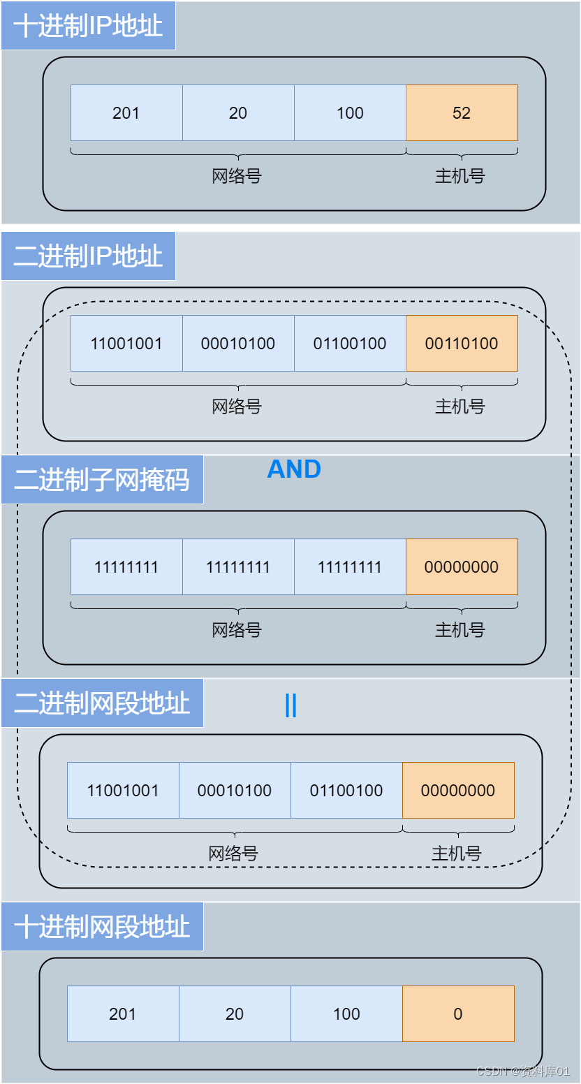 将子网掩码和 IP 地址进行与( AND )运算,可得到这个 IP 地址的网段地址。