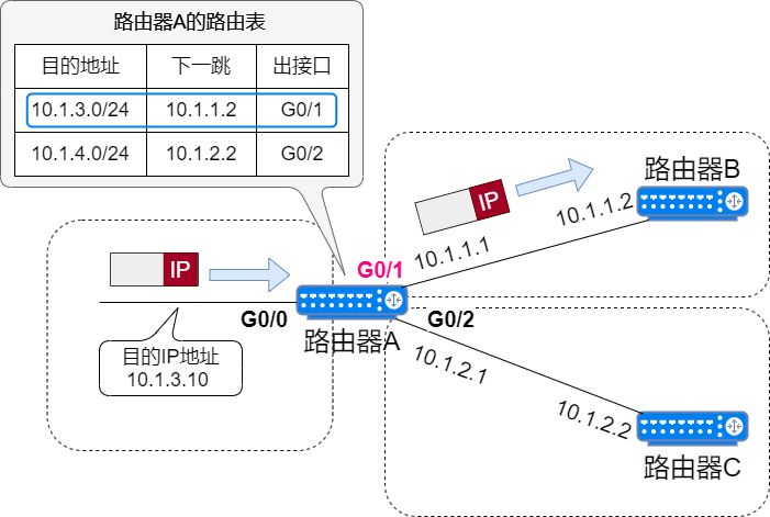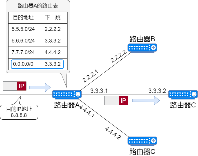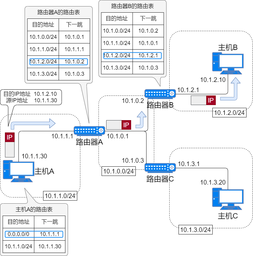为了将数据包发给目的节点,所有节点都维护着一张路由表。路由表记录 IP 数据在下一跳应该发给哪个路由器。IP 包将根据这个路由表在各个数据链路上传输。