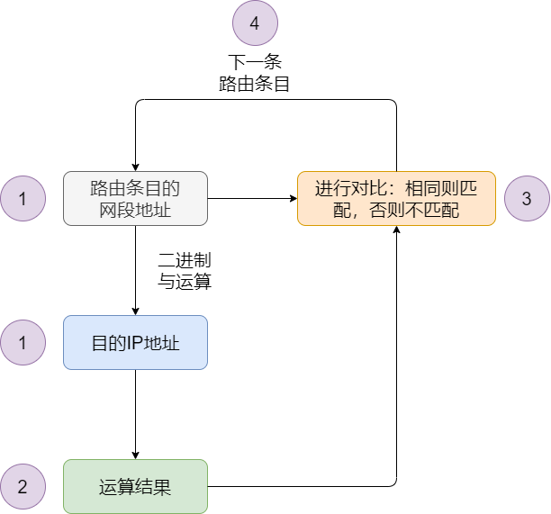 查找匹配的路由条目,就需要将数据包的目的 IP 地址与各个路由条目的网段地址先进行二进制与( AND )运算,再将运算结果与路由条目的网段地址进行比较,若一致则该条目与目的 IP 地址相匹配。最后,与所有路由条目完成运算和比较,可得到一条或多条相匹配的路由条目。也可能没有匹配的路由条目,那么丢弃数据包。