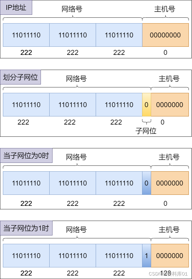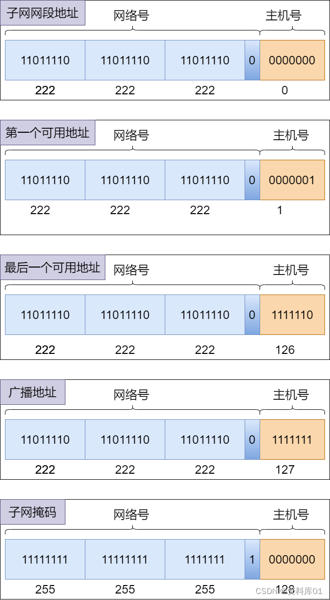 - 计算子网地址:当主机号有 7 位时,网络号有 32 - 7 = 25 位,也就是 222.222.222.0/24 向主机位借了一位作为子网位,那么子网掩码也就是 255.255.255.128 。可分配 222.222.222.0/25 使用。
