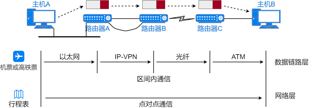 高铁票、地铁票只能在一个区间内移动,就像网络上的数据链路。出发点就像源 MAC 地址,目的地就像目的 MAC 地址,整个行程表的作用就相当于网络层,出发点就像源 IP 地址,目的地就像目的 IP 地址。