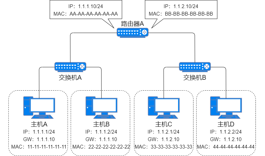 - 路由器收到 ARP 广播请求报文后,将主机 A 的 MAC 地址和对应端口添加到自己的 MAC 表中,然后查看目的 IP 地址发现是请求自己的 MAC 地址,于是单播发送 ARP 响应报文;