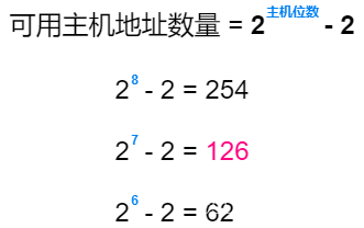 当主机号全为 0 时,表示的是网段地址,非主机地址。当主机号全为 1 时是广播地址,也不是主机地址。因此在分配 IP 地址过程中,需要排除这两个地址。例如一个 C 类地址 192.168.1.0/24 最多只有 254 个可用主机地址,而不是 256 个。