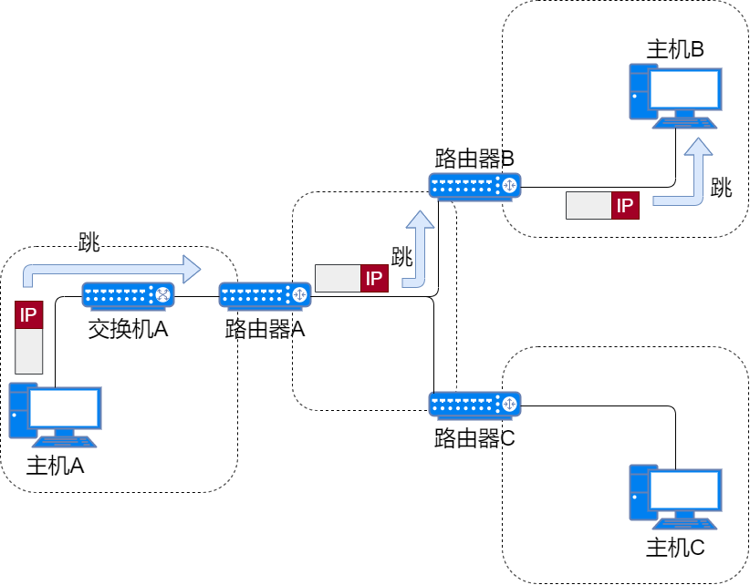 Hop ,中文叫“跳”。它是指网络中的一个区间。IP 包就是在网络中一跳一跳的转发,在每一个区间内决定 IP 包下一跳的路径。