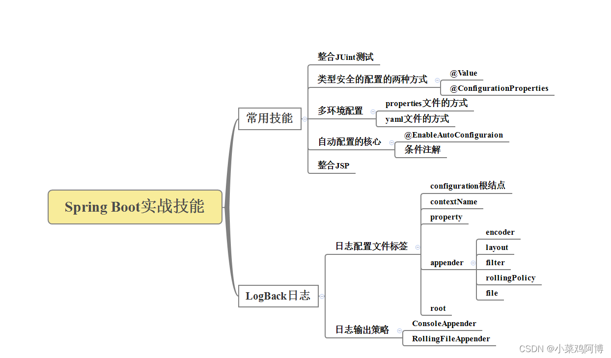 本文详细介绍了SpringBoot的核心技能,包括JUnit测试的整合、配置文件的读取与多环境切换、自动配置原理、整合JSP模板和XML配置,以及LogBack日志配置。