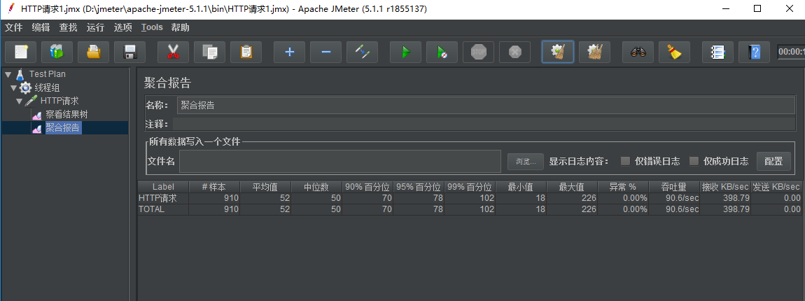 查看聚合报告,样本数是固定的50,达到50个后会结束