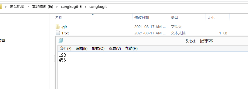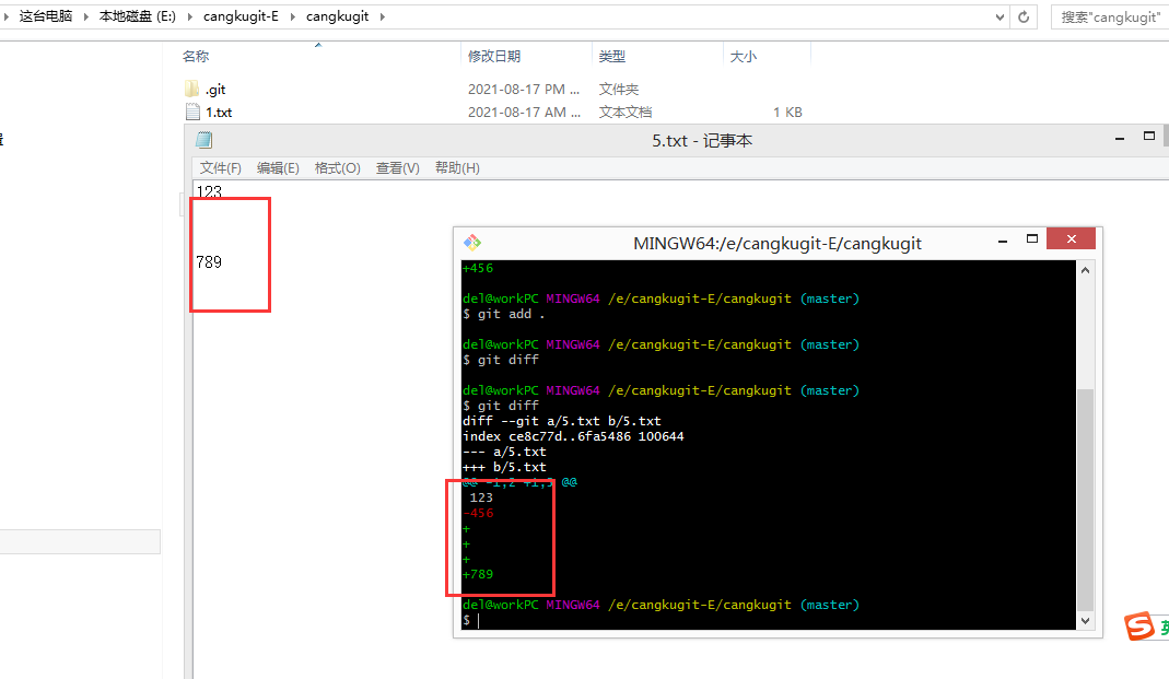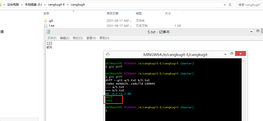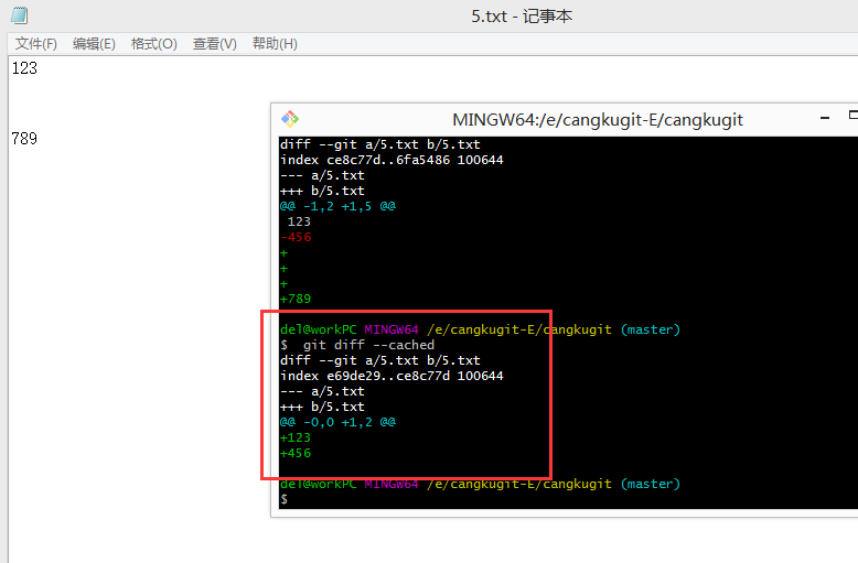 此时我在工作区里面的5.txt里面增加内容,然后再操作: