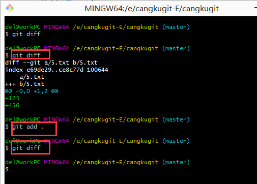 我把修改好的5.txt进行git add . 然后再执行git diff命令,就发现没有区别了: