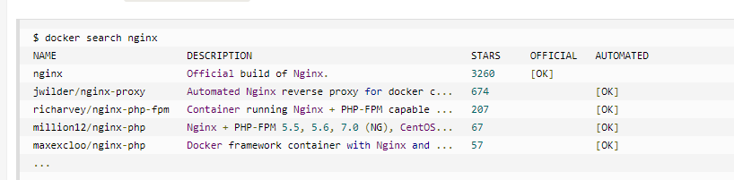 此外,我们还可以用 docker search nginx 命令来查看可用版本: