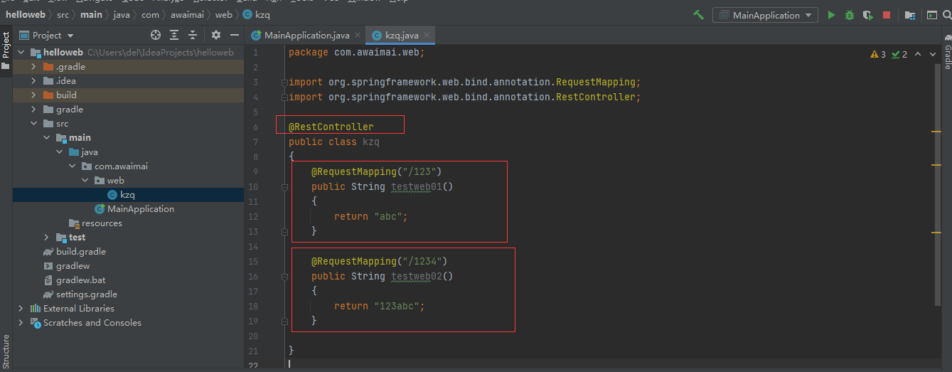 该博客展示了如何使用 Spring 的 RestController 注解创建控制器,处理 '/123' 和 '/1234' 两个不同的页面访问请求。testweb01() 方法返回 'abc',而 testweb02() 方法返回 '123abc',实现了简单的 web 接口功能。