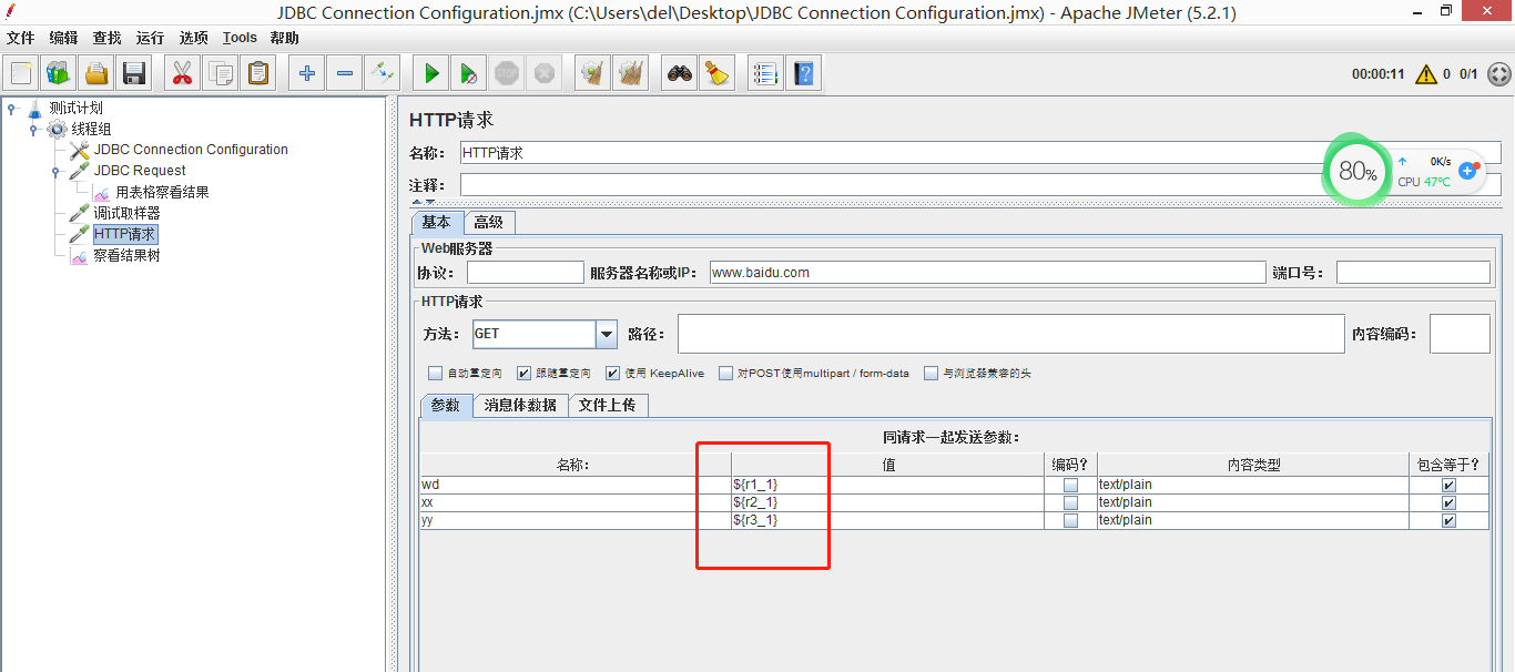 在jmeter中是这样规定的,当Variable Names设置值为rs1,rs2.rs3,则rs1,rs2.rs3分别代表了查询结果集中的第一列,第二列,第三列;