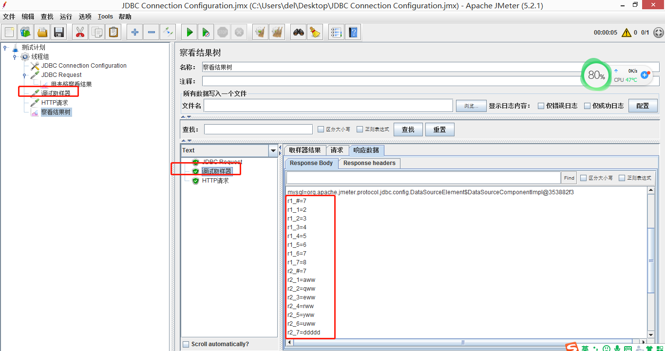 当Variable Names设置为rs1,,rs3,添加Debug Sampler,查看结果为,结果集中仅包含了第一列和第三列所有行的数据