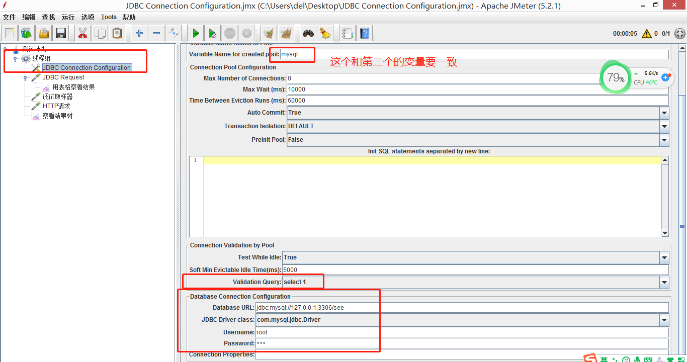 二、线程组添加 JDBC Connection Configuration (添加->配置元件-> JDBC Connection Configuration)用于配置Jmeter和Mysql的连接;