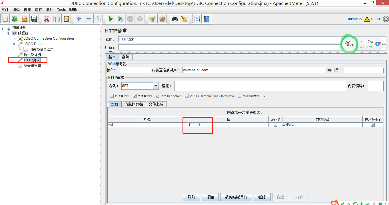 1、上面查询结果的变量名为userId,返回的是单个字段值,在使用时,调用格式为:${userId_1},表示调用结果集的第一列第一行数据