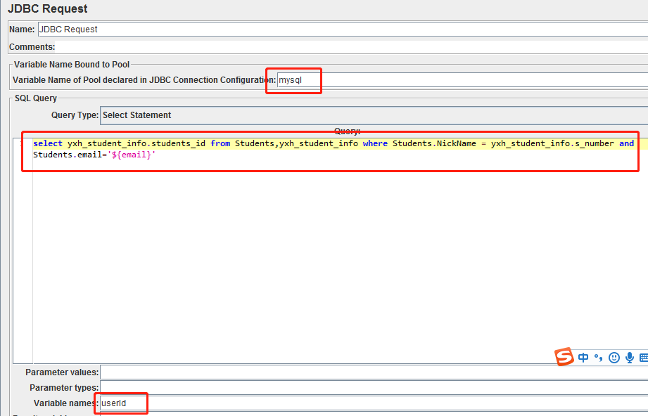 Variable Name:数据库变量名,和JDBC Connection Configuration中的Variable Name保持一致