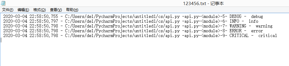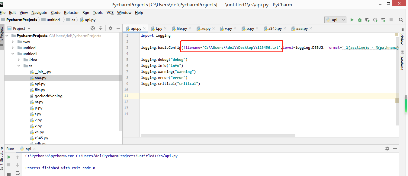logging.basicConfig(filename='C:\\Users\\del\\Desktop\\123456.txt',level=logging.DEBUG, format=' %(asctime)s - %(pathname)s -%(filename)s-%(funcName)s-%(lineno)d- %(levelname)s - %(message)s ')