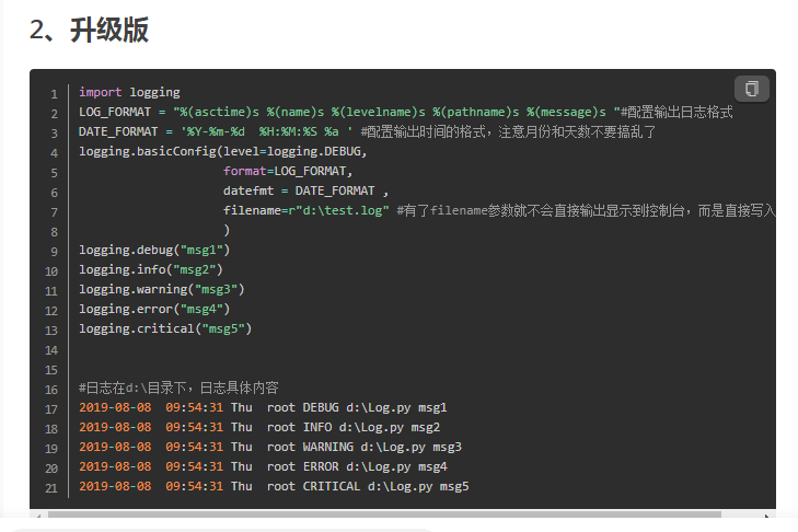 通过logging.basicConfig函数进行配置了日志级别和日志内容输出格式