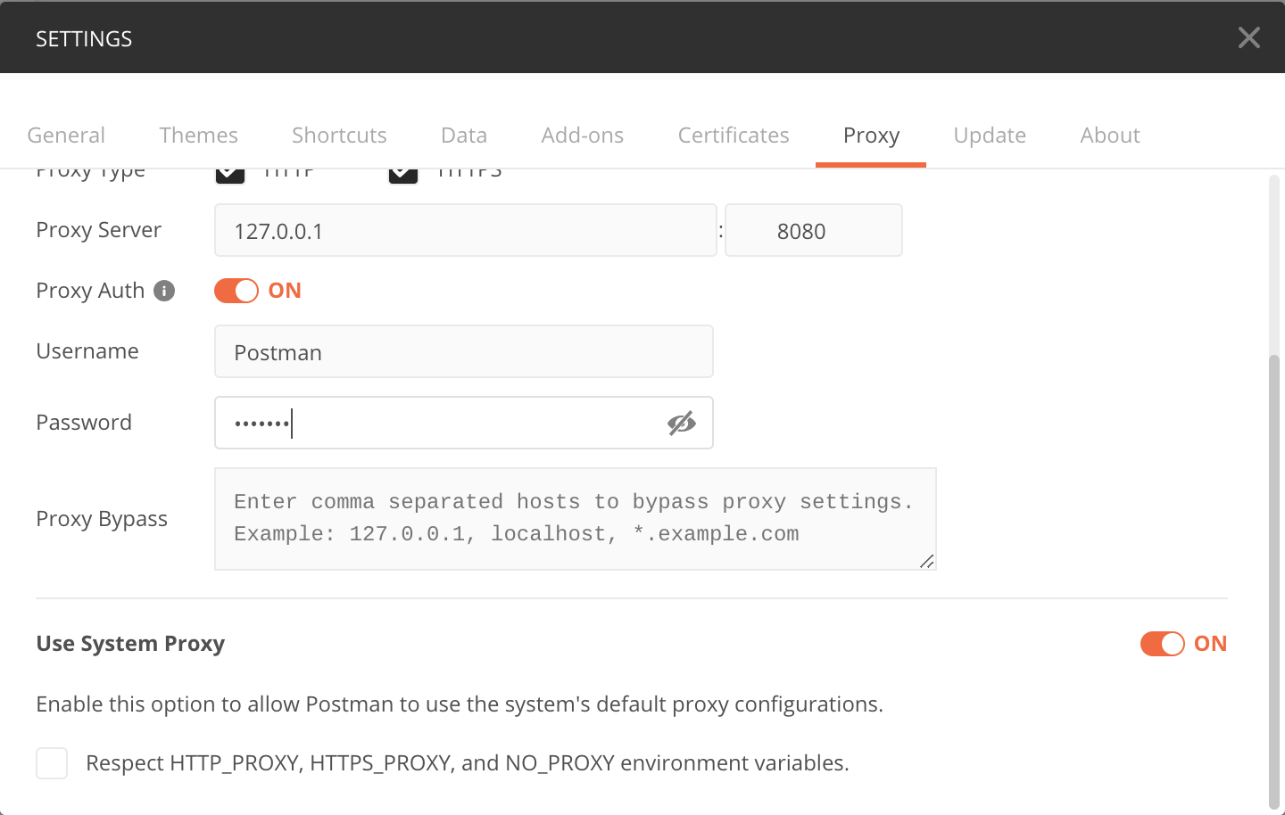 默认情况下启用系统代理设置。通过Postman发出的任何请求都将通过系统代理。