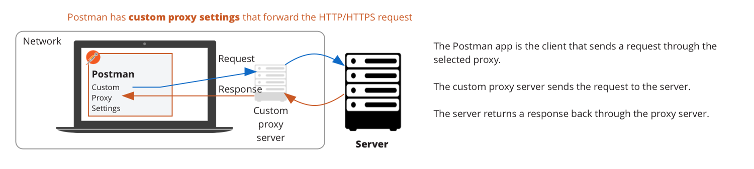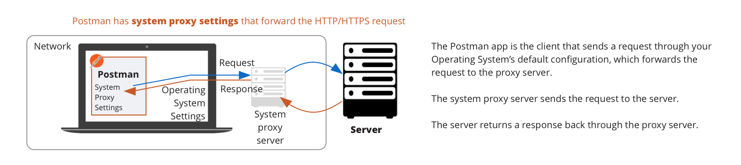 - 邮递员应用程序是通过操作系统的默认配置发送请求的客户端,该请求会将请求转发到代理服务器。