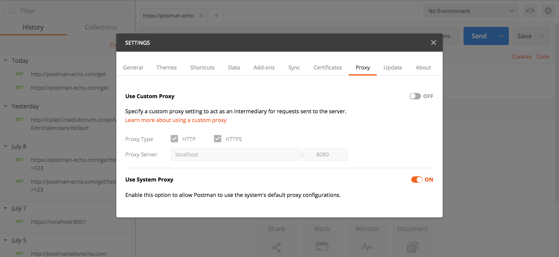 适用于Mac,Windows和Linux的Postman本地应用程序支持配置代理。您可以指定使用自定义全局代理,也可以使用在操作系统中定义的系统代理。