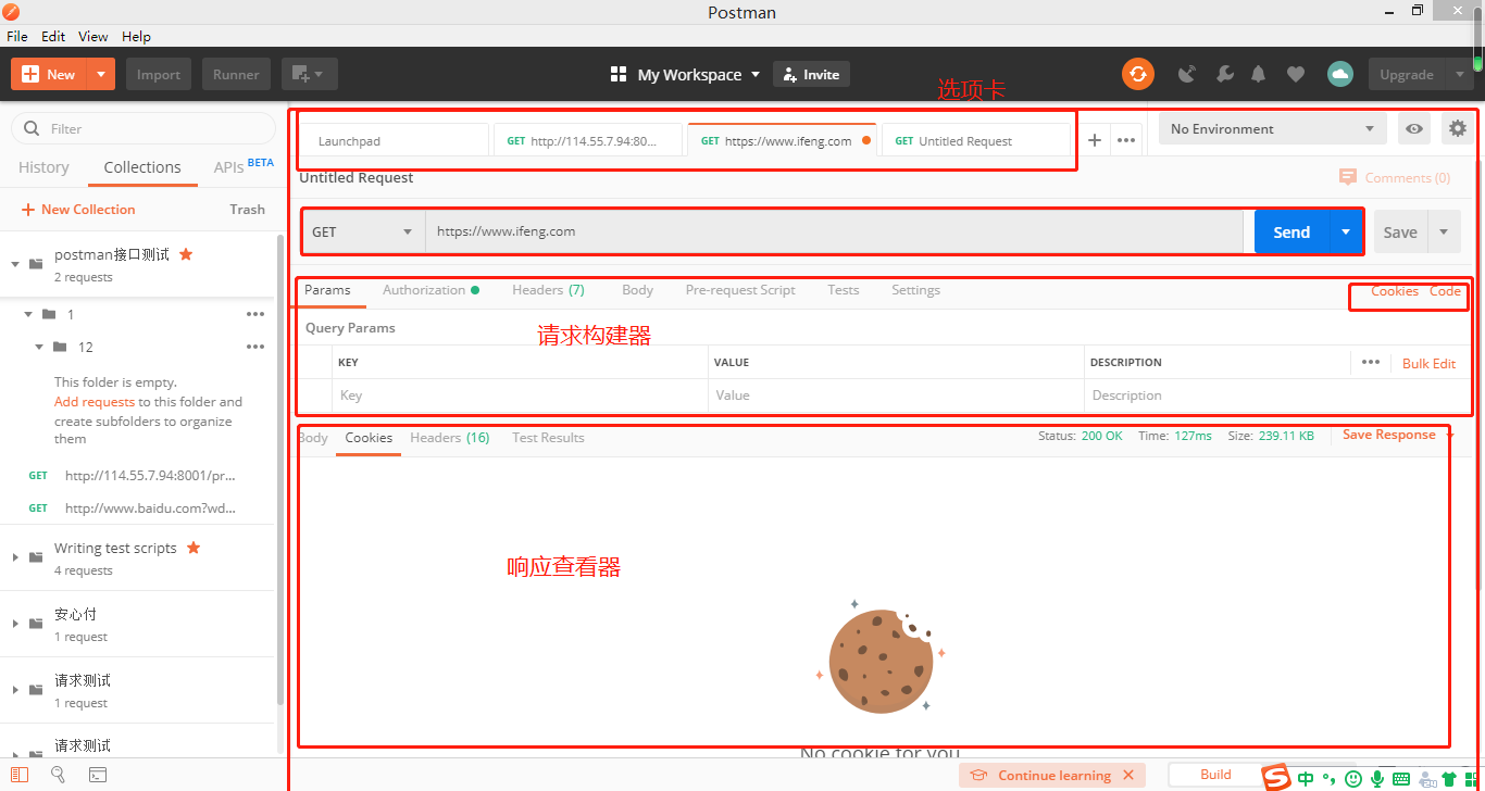 postman的构建器(builder)是一种选项卡布局模式,用户可以在构建器中发送和管理API请求。上部分是请求构建器,下部分是响应查看器。