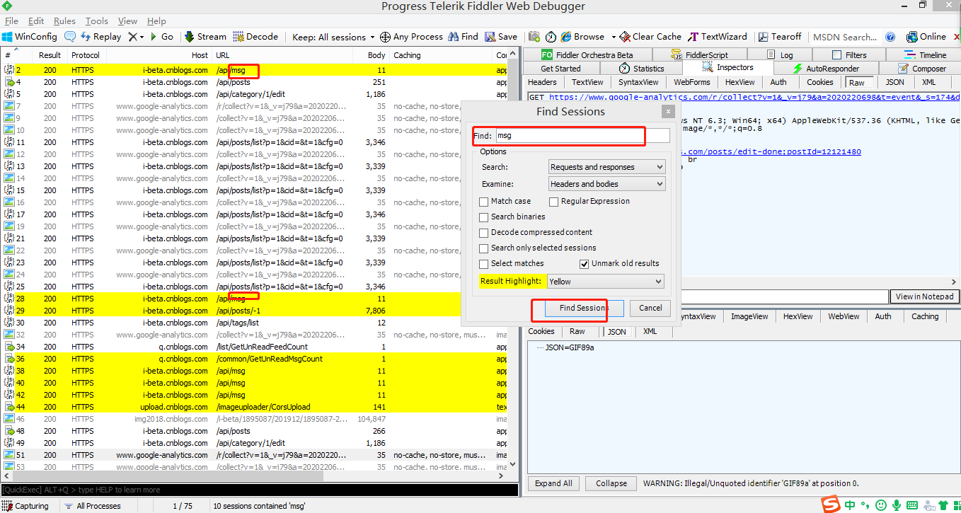在菜单栏中单击edit——>find sessions;打开 find sessions的对话框,输入关键字查找要查询的会话。查到的会话系统以黄色显示: