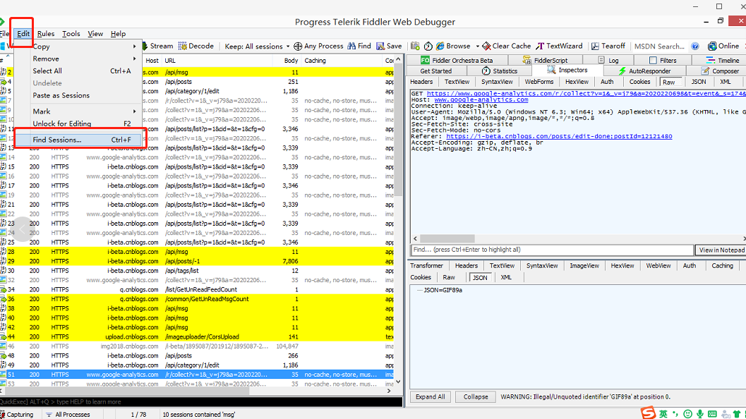 本文介绍了一种在菜单栏通过edit-find sessions查找特定会话的方法,特别指出在HTTP请求中查询汉字或特殊字符可能遇到的问题及原因。由于汉字和特殊字符在请求中会被转义,直接搜索可能无法找到结果。