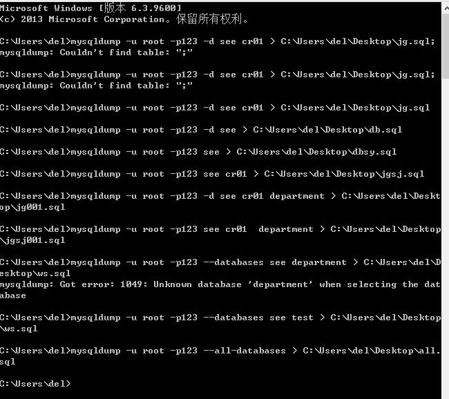 mysqldump -u root -p123 see cr01 > C:\Users\del\Desktop\jgsj.sql