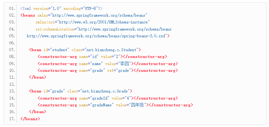 - 在 <bean> 元素内使用 <constructor-arg> 元素,对构造函数内的属性进行赋值,Bean 的构造函数内有多少参数,就需要使用多少个 <constructor-arg> 元素。