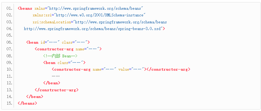 我们可以通过构造方法注入内部 Bean。此时,我们只需要在 <bean> 标签下的 <constructor-arg> 元素中,再次使用 <bean> 元素对内部 Bean 进行定义,格式如下。