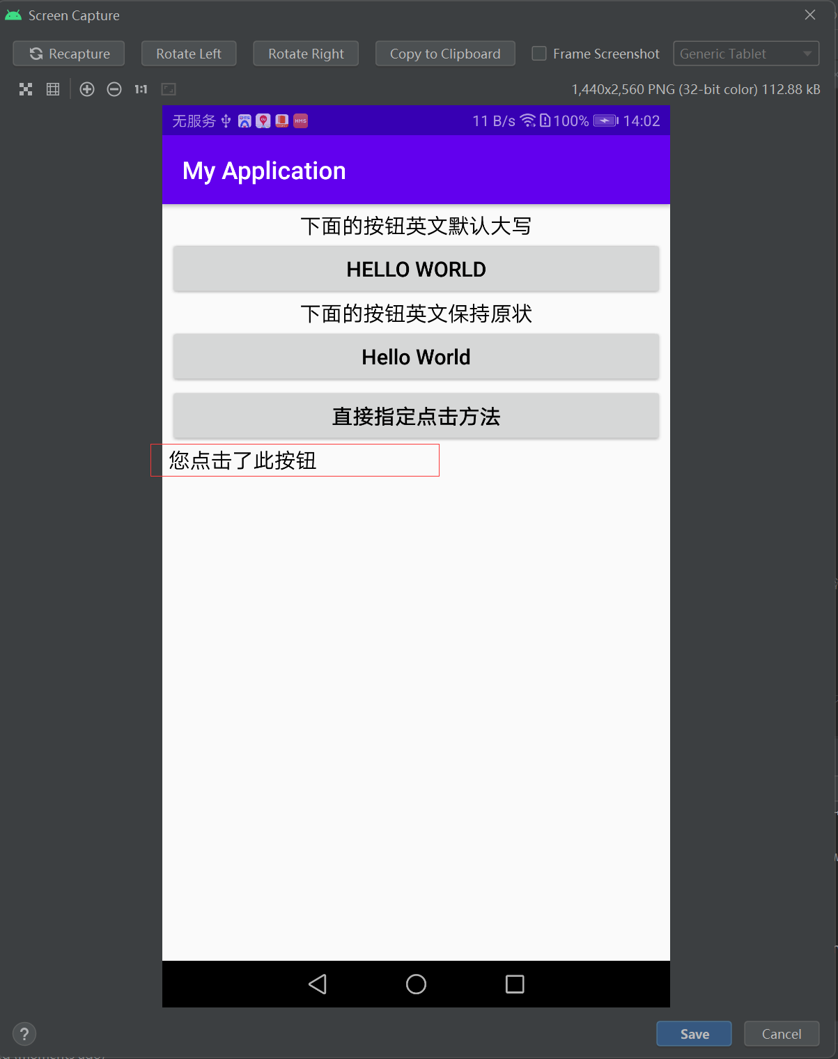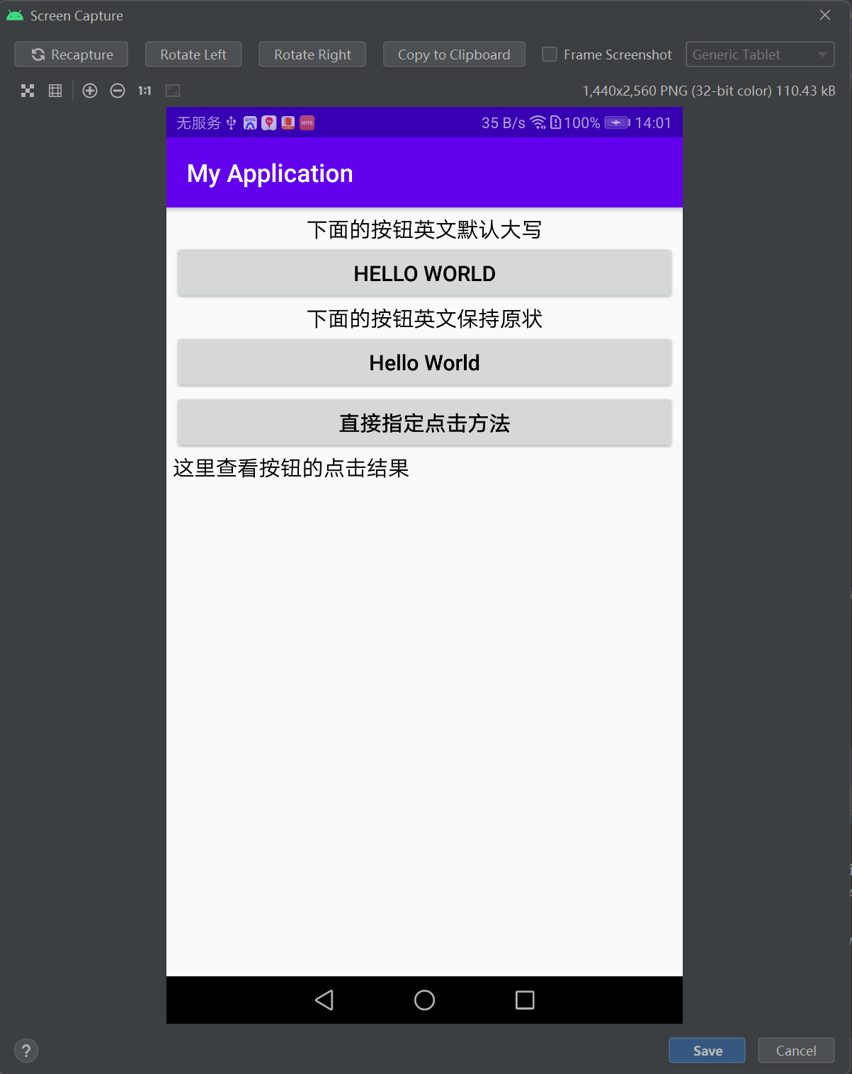 android:text="这里查看按钮的点击结果"